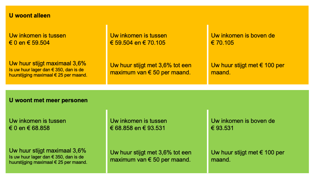 De overheid stelt ieder jaar regels vast voor de huurverhoging. Mozaïek Wonen volgt deze regels. Zo mogen we wettelijk een huurverhoging van maximaal 4,1% vragen. Maar bij ons is dit jaar de algemene huurverhoging voor onze huurwoningen 3,6%.Niet alle huurders krijgen dezelfde huurverhoging. Het is ook afhankelijk van het soort woning en persoonlijke omstandigheden. In de brief die onze huurders ontvangen, staat met welk percentage of met welk bedrag de huur voor hen verandert.