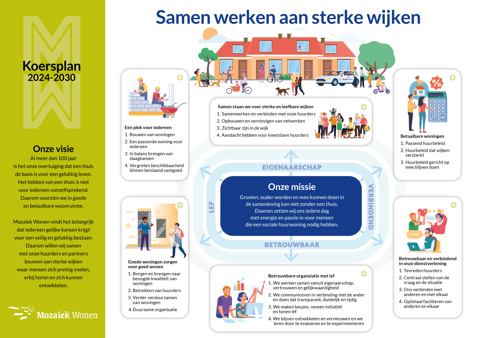 Mozaïek Wonen vindt het belangrijk dat iedereen gelijke kansen krijgt voor een veilig en gelukkig bestaan. Daarom willen wij samen met onze huurders en partners bouwen aan sterke wijken waar mensen zich prettig voelen, erbij horen en zich kunnen ontwikkelen.